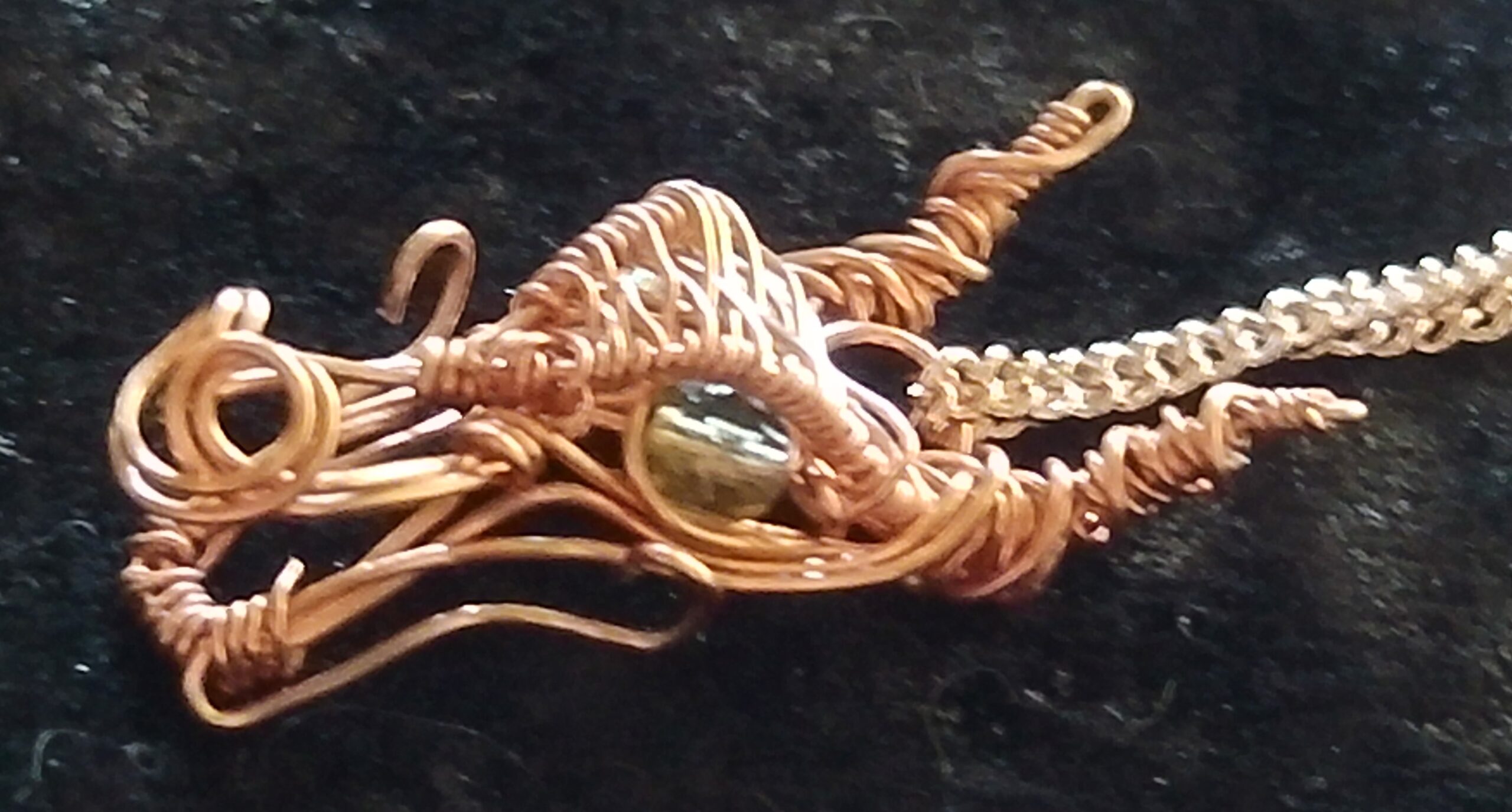 Bare copper wire wrapped dragon head with green glass bead eyes and copper color chain, about 2 inches.