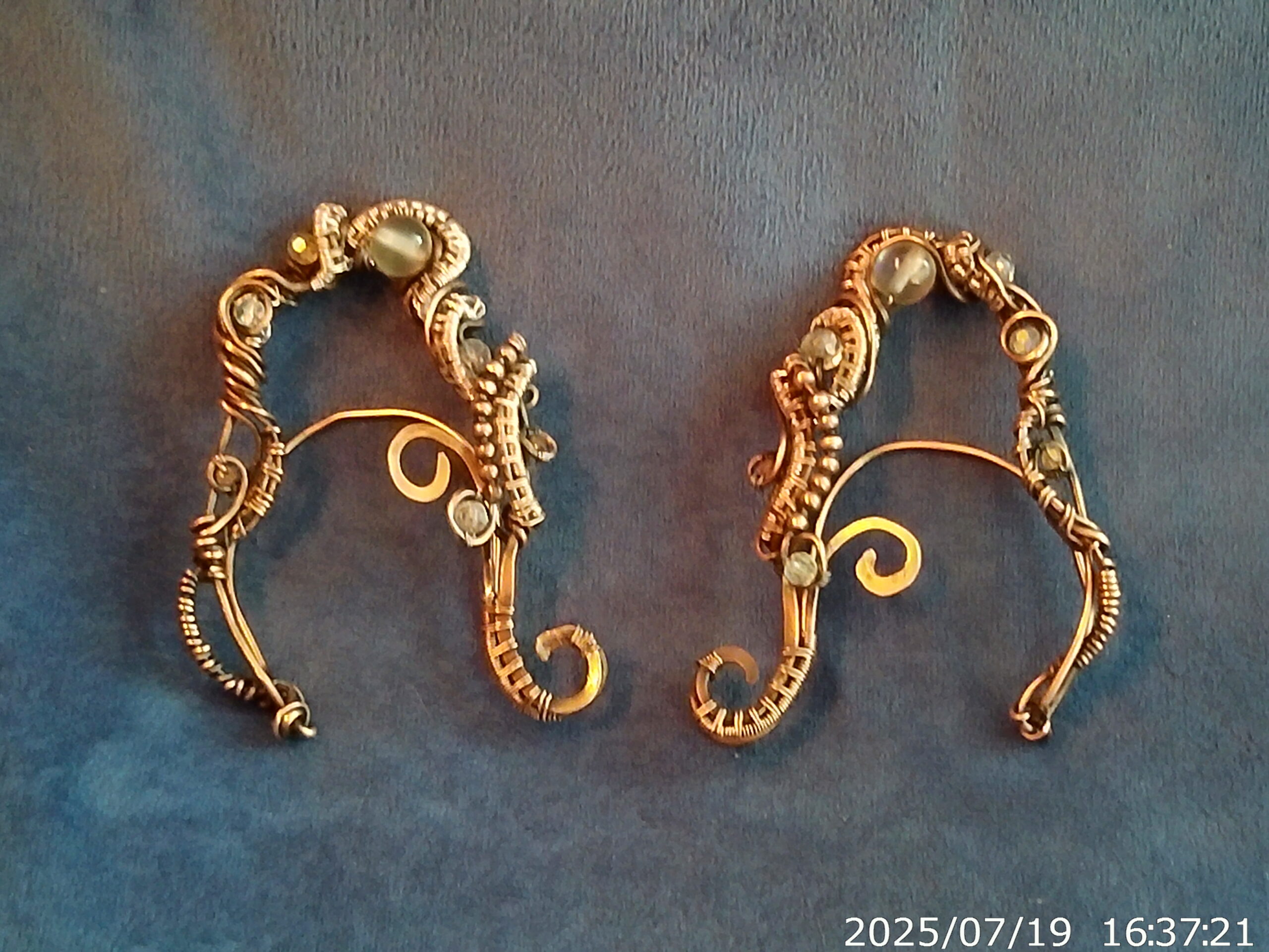 Elven ear cuffs, wire wrapped antiqued copper with clear glassed beads. These fit over the ears.