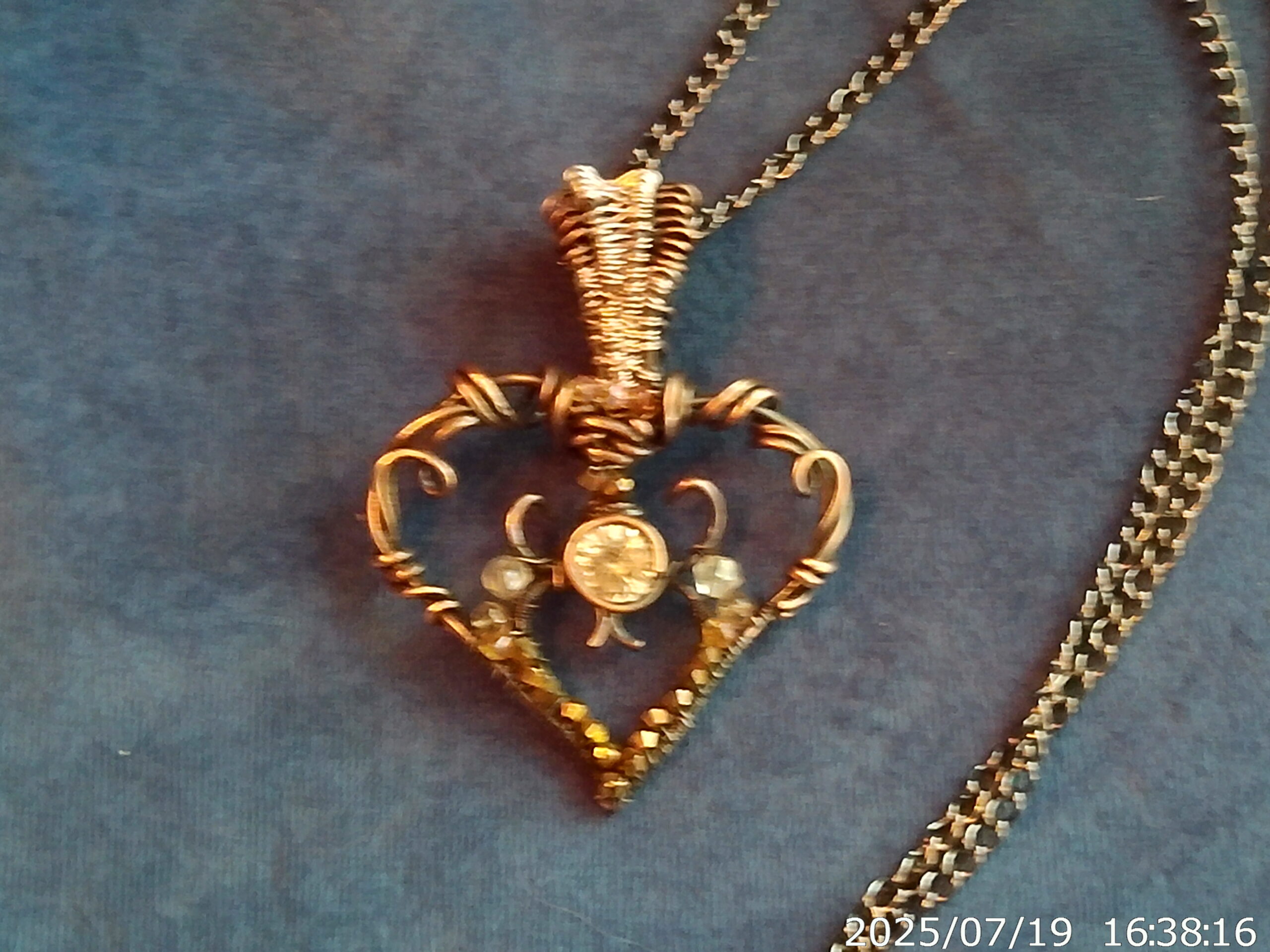 Large wire wrapped antique copper heart with clear crystals with a 20.5-inch black chain